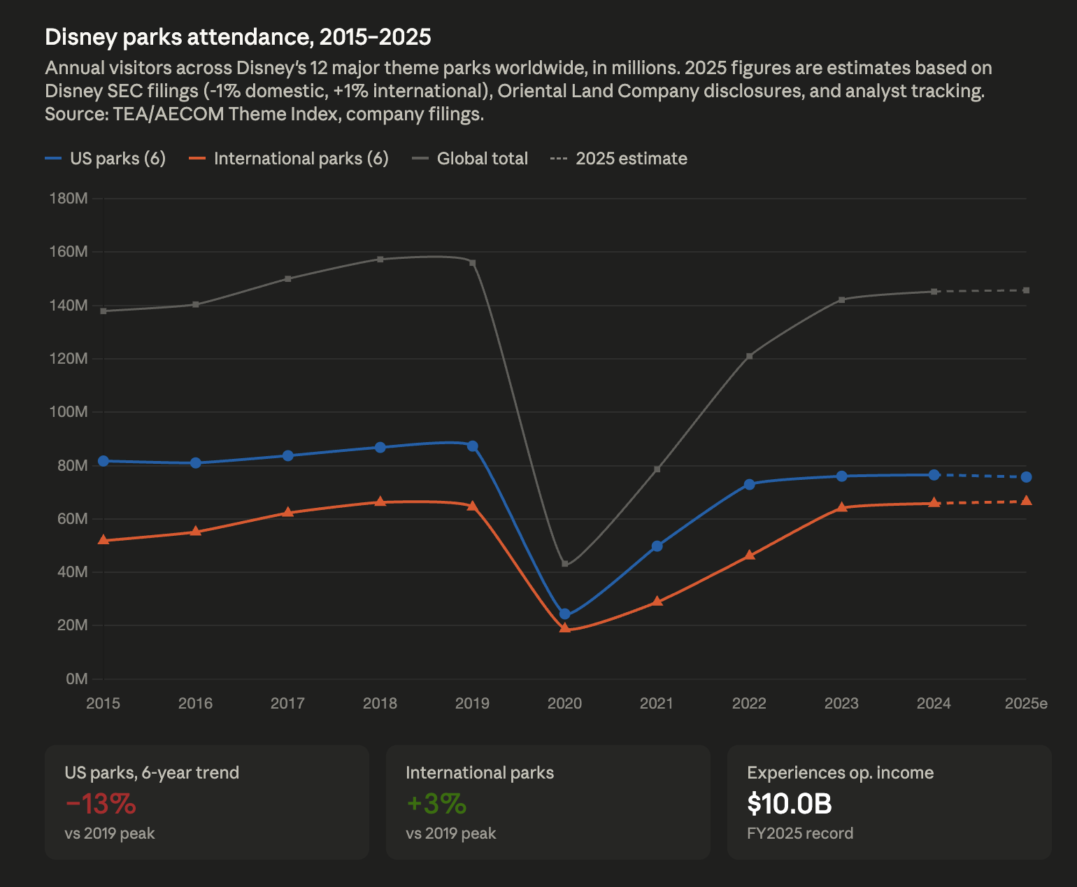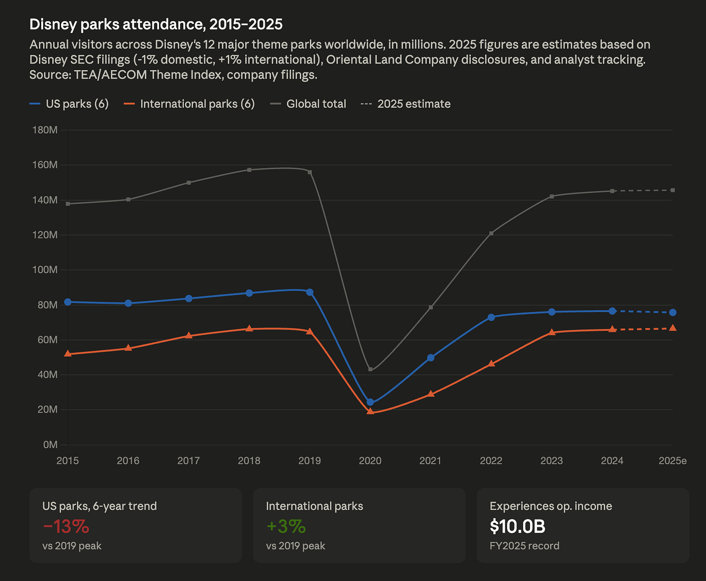 Disney is committing $60 billion to park expansions over the next decade. It’s building a brand-new resort in Abu Dhabi, and it’s nearly doubling its cruise fleet to 13 ships by 2031. There’s a new Avatar Land coming to Anaheim. Last quarter, the Experiences division crossed $10 billion in revenue for the first time.